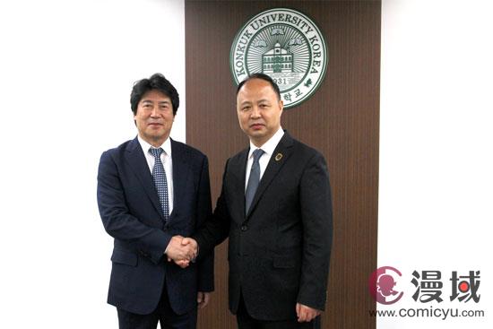 ▲吉林动画学院董事长、校长郑立国与韩国建国大学校长闵相基亲切会面