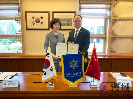 ▲吉林动画学院董事长、校长郑立国与韩国淑明女子大学校长姜贞爱进行签约仪式