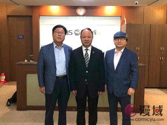 ▲吉林动画学院董事长、校长郑立国、韩国KBS媒体代表禹钟宅、具钟祥亲切会面
