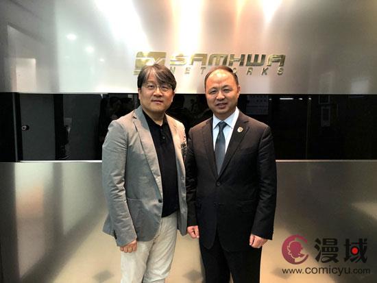▲吉林动画学院董事长、校长郑立国、韩国Samhwa Networks公司社长安在宪亲切会面
