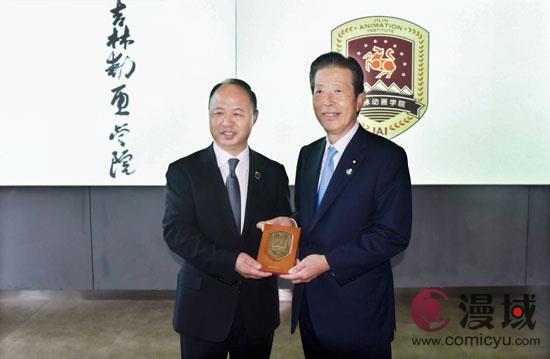 日本公明党党首、参议员山口那津男与吉林动画学院董事长校长郑立国合影留念