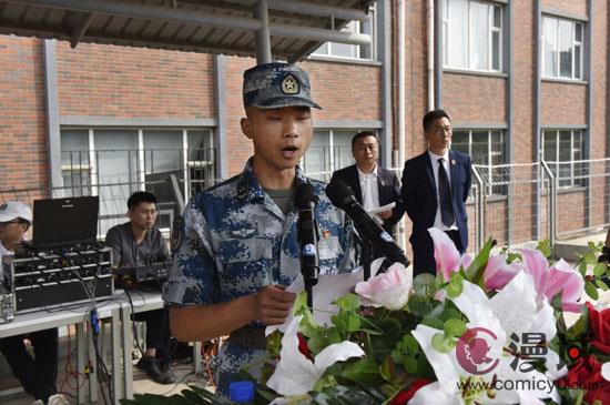 中国人民解放军93246部队闫达上士代表军训团发言。他说,军训期间我们会严格遵守军训的有关要求和学校的管理规定,听从军训团的管理。积极配合各位领导和辅导员的工作,虚心请教,以求共同提高,圆满完成军训任务。