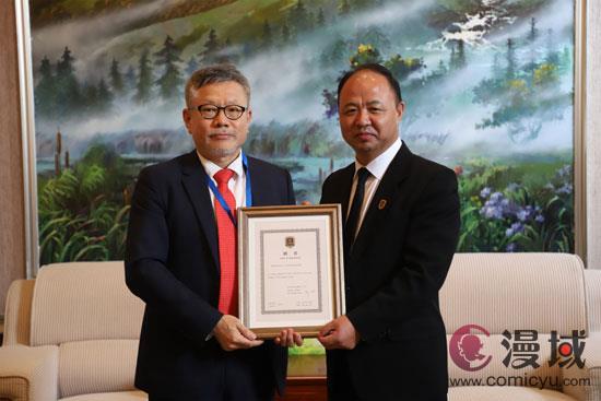开幕式结束后,我校董事长、校长郑立国为部分专家学者颁发聘书,聘任原中国动画学会会长、原上海美术电影制片厂厂长、广东省动漫艺术家协会副主席金国平,韩国Signal Pictures公司首席执行官金玎峨,韩国艺术综合大学映像院电影系教授吴明勋,韩国国立艺术综合大学映像院电影系教授崔容培,韩国建国大学影视电影系教授宋洛元,音乐创作人,知名作词人代岳东,韩国KBS媒体公司智能事业群本部长全镇学,韩国导演、制作人金义石为我校客座教授。