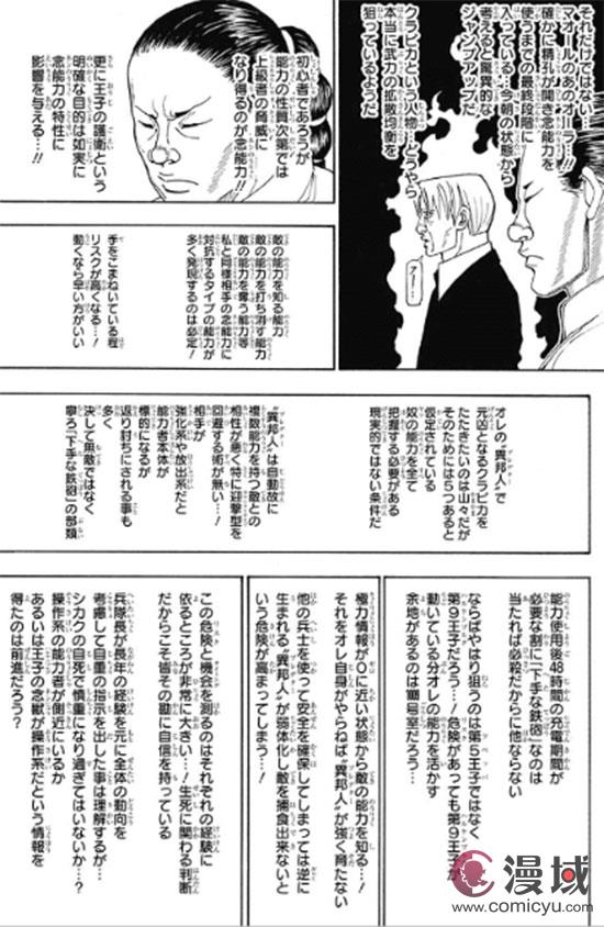 最后谈谈《全职猎人》,富坚老贼的作画和思想似乎总是处于“歇斯底里”的状态,有时候大量文本几乎铺满书页,比如第388话,一共7格文本就占了5格,有时候整篇鬼画符几乎没有台词,比如后期的《幽游白书》,全让读者去YY,似乎总体上都透露着“懒画”的高深意境,喜欢的喜欢,不喜欢的嗤之以鼻。
