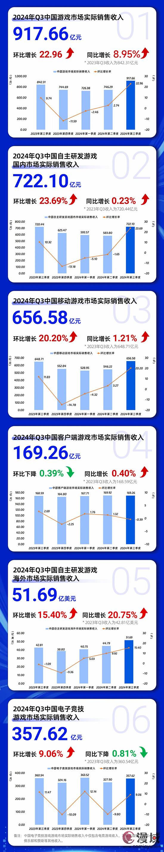 报告中指出,2024年第三季度中国游戏市场收入917.66亿元,环比增加22.96%,同比增长8.95%,中国自主研发游戏海外市场实际销售收入51.69亿美元(约合人民币368.35亿元),环比增长15.40%,同比增长20.75%,2023年这一数据为42.81亿美元(约合人民币305.07亿元),而《黑神话:悟空》则是中国自主研发游戏在海外市场表现突出的主要原因。