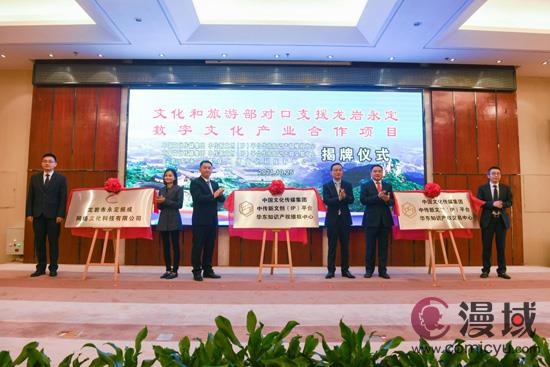 10月25日,中国文化传媒集团旗下中国文化传媒新文创(IP)平台与福建省龙岩市永定区人民政府共同建设的永定区数字文化产业园、中国文化传媒集团中传新文创(IP)平台华东知识产权维权中心(简称中传华东知识产权维权中心)、中国文化传媒集团中传新文创(IP)平台华东知识产权交易中心(简称中传华东知识产权交易中心)合作签约暨揭牌仪式在永定举行。中国文化传媒集团党委书记、董事长兼《中国文化报》社社长刘强,龙岩市政府党组成员马勇出席揭牌仪式并见证活动,永定区委书记李强,永定区委副书记、代区长李宏泰,中传悦众(北京)文化发展有限公司执行董事兼总经理秦智勇等领导出席活动。