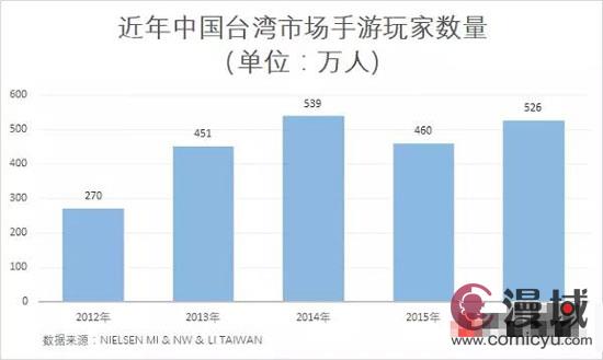 中国台湾2300万人口众所周知,而根据Nielsen MI & NW & LI Taiwan提供的数据,中国台湾手游用户总数在2014年达到539万人的顶峰,随后次年下滑到460万,在2016年才重新开始回暖到526万。主机游戏、客户端游戏、网页游戏用户与手游用户呈此消彼长之势。