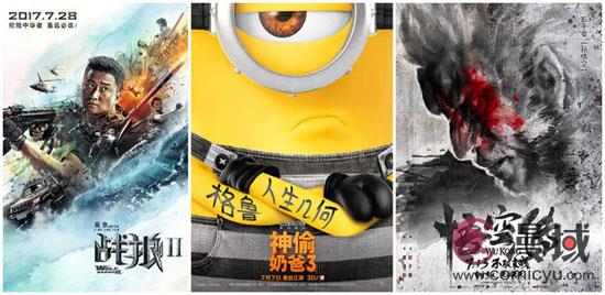 在7月首映的36部电影中,国产片33部,进口片3部。7月国产片贡献票房约36亿,进口片贡献票房约14亿(均包含6月首映影片在7月斩获的票房)。7月票房前三名分别由《战狼2》、《神偷奶爸3》、《悟空传》夺得。