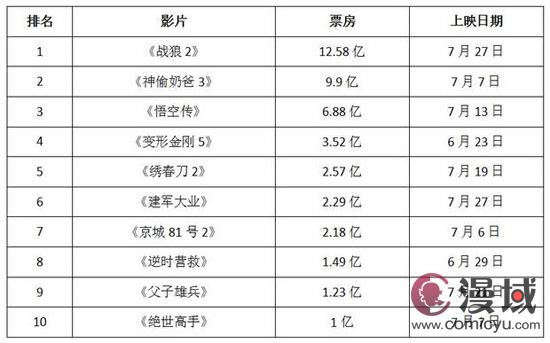 2017年7月内地票房TOP10