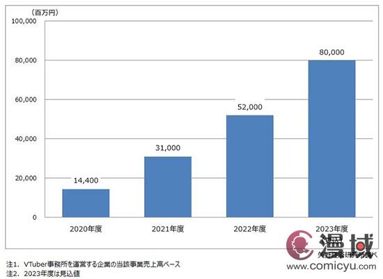 根据调查,近几年因为疫情的影响,导致VTuber业急速发展壮大,2022年的市场规模就达到520亿日元,是前一年的167.7%,2023年度的市场规模预计将达到800亿日元。
