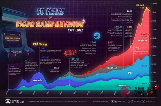 最近的一份新报告包含了从1970年至2022年的游戏收入,报告总结了50多年的收入情况。到2022年,PC游戏市场总收入达到450亿美元,而所有主机平台的总收入为300亿美元。