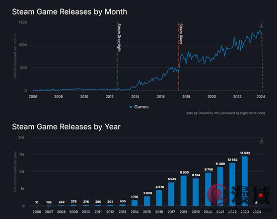 根据SteamDB的统计数据显示,2023年Steam上一共发布了14532款游戏,创造了历史新高,2023年是Steam有史以来游戏发行量最高的年份。