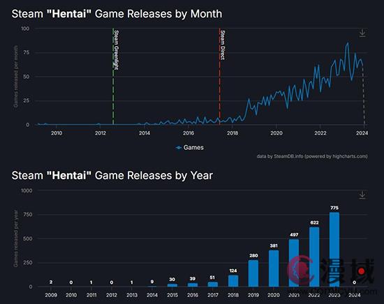 这些数据来自SteamDB的Steam Game Release Summary(Steam游发布总结)页面,该页面不仅可以查看游戏发布总量,还可以按标签筛选游戏类型,例如:2023年Steam上总共发布了775款“黄油”游戏。