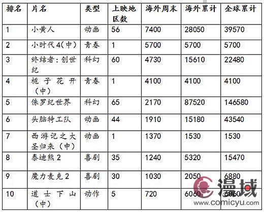 得益于暑期档“国产电影保护月”(该保护期实际上远远超过1个月)的渐入佳境,上周末一共有4部国产电影打入海外票房前十。《小时代4》内地4天开画票房达到5100万美元,创系列最佳开局;何炅的导演处女作《栀子花开》同样不甘示弱,3天入账4100万美元。好评如潮的《西游记之大圣归来》上周末内地票房报收1370万美元,根据其目前走势,本片最终将刷新《熊出没之雪岭熊风》(4750万美元)保持的国产动画电影的票房纪录。此外,陈凯歌的《道士下山》内地上映2周累计票房达到6060万美元。