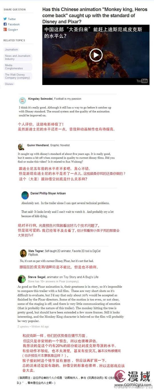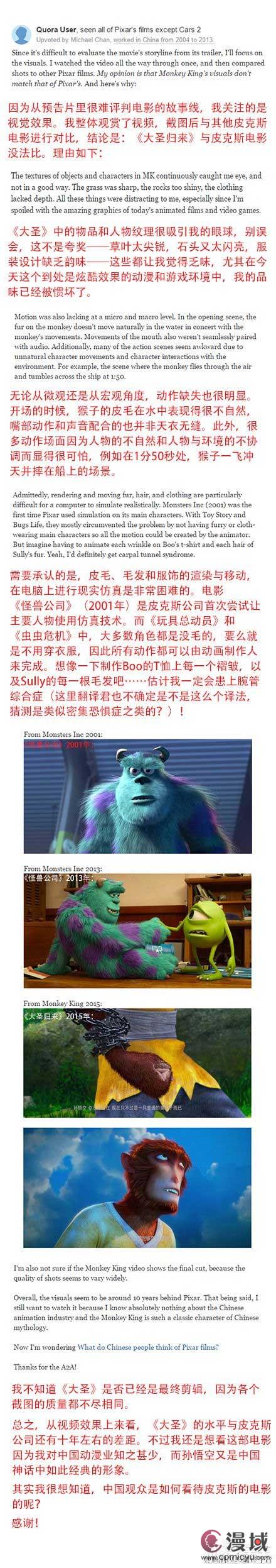 对于这部电影,我们之前看到的评论绝大多数是来自国内网友的。但是本作之前也在国际电影上公开过预告片,而且不少的外国人也觉得本片挺不错的。但是还是有不少老外提问,中国这部《大圣归来》能赶上迪士尼或皮克斯的水平么?现在有网友在Quora上发表了一篇分析贴,之后引来不少人回帖,回帖的网友中有的从事动画业,甚至还有人参与过皮克斯《玩具总动员》的制作。细看之下他们的回帖还是比较中肯的。最后他们还是认为:从视觉效果上看,《大圣归来》的视觉效果水平离皮克斯公司还有十年差距,之所以想看这部电影,除了向多了解中国动画外,还因为孙悟空是中国动画中如此经典的形象。