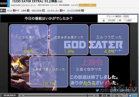 或许是因为这样,本周的niconico直播上面就发生了悲剧——在《噬神者》直播后的评价方面,给出“非常满意”的观众只有8.5%,“非常不满意”竟高达75.1%。这应该是因为观众们在收看时发现不是第4话,得知自己被制作组戏弄后一气之下给出差评的吧。