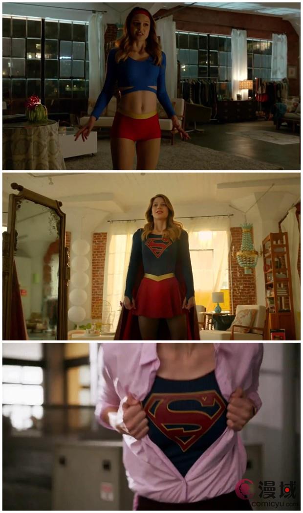举个例子,编剧们意识到了角色的名字(Supergirl而不是Superwoman)引起了一些争议,有观点认为以“女孩”来命名依然带有性别偏见色彩。因此他们便写了一场Kara就此问题与Cat进行争辩的戏,正是Cat为了迅速抢占社交媒体话题而创造出了Supergirl这个名字。还有一场有趣的戏是Kara为自己选择女超人的服装,她在Winn的参谋下,前后换了好几套不同的衣服,最后才定下了一个造型。很多女性超级英雄的服装——尤其是在一些早期的媒体上,比如原作漫画和七八十年代的电视剧里——都被指责体现了双重标准,比男性英雄的服装要暴露得多,明目张胆地强调性吸引,而不是功能性。《女超人》在这点的处理上很有意思,让Kara试穿了不同布料的服装、不同长度的裙子,以及披风等,最终定下来一套在怀旧和现代之间找到完美平衡的装束。(服装由柯琳·阿特伍德设计,《绿箭侠》和《闪电侠》的主角服装也是她设计的。)