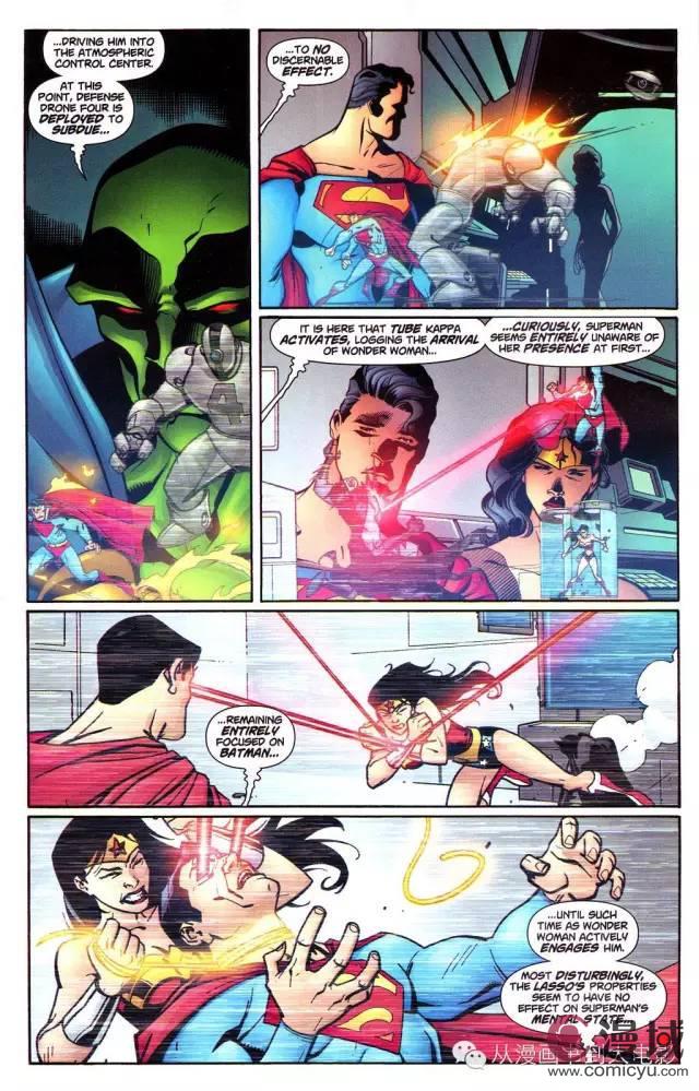 大致过程:超人受幻象干扰,以为是在对抗达克赛德和布莱尼亚克,结果实际上是蝙蝠侠,瞭望塔防御系统启动但毫无用处,蝙蝠侠惨遭蹂躏(几页纸以后就恢复得差不多了),直到神奇女侠赶到救了他一命。