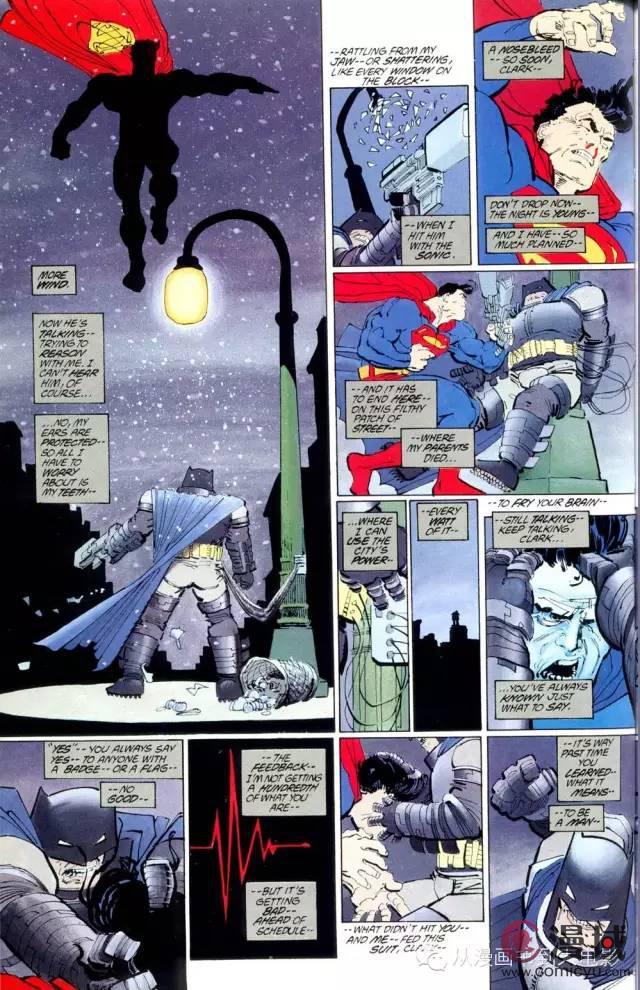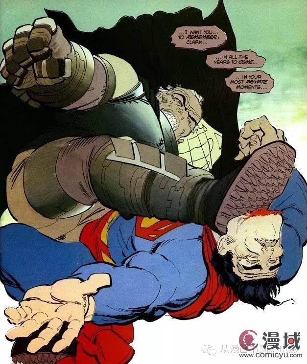 实力对比: 超人被苏联的核武器爆炸严重削弱,同时核爆炸产生的阴霾遮住了太阳让超人失去了能量来源,而且超人并不想用武力制服蝙蝠侠,不肯下重手。