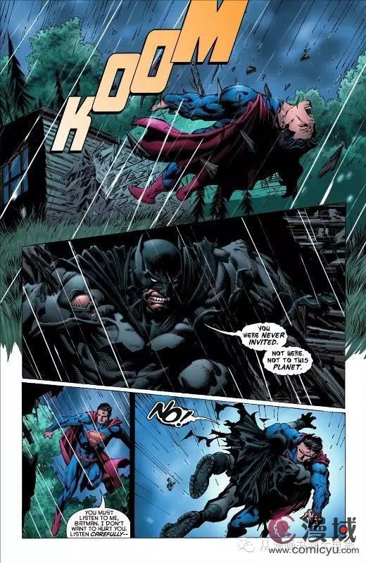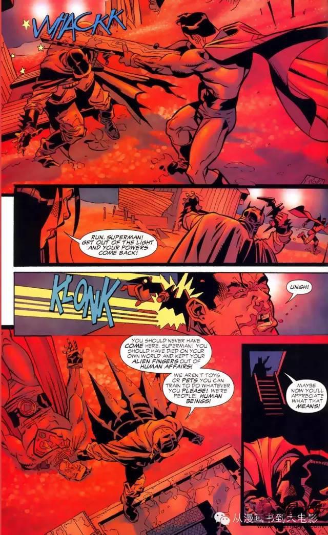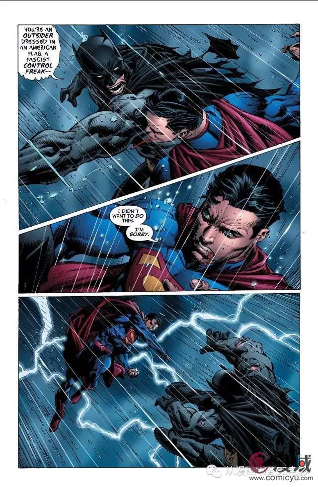 大致过程:蝙蝠侠给了超人几拳,超人劝说无效后一拳将蝙蝠侠打到地上。