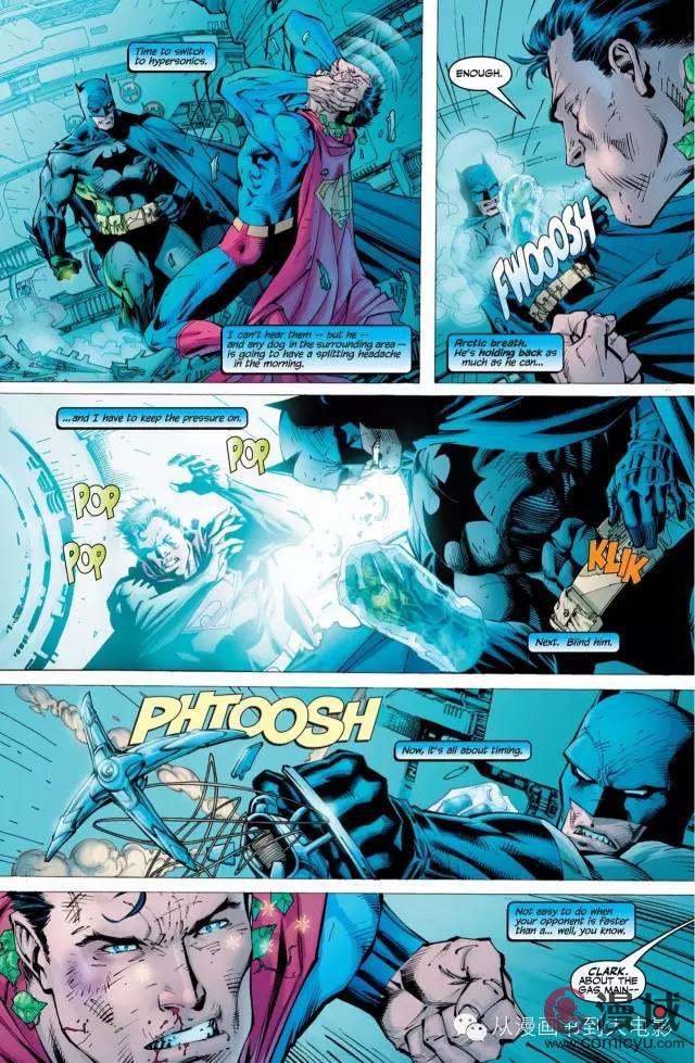 大致过程:蝙蝠侠用尽所有道具,给超人造成了一滴汗的杀伤(just broke a sweat),最后指挥绿箭侠射出氪石箭(绿箭差点搞砸)将超人击倒,随后蝙蝠侠倒地阵亡(假死)