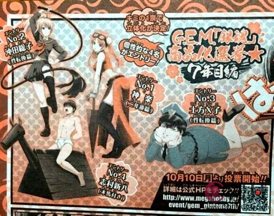 此次投票的对象共有4个,第1个是两年后篇中身材热辣的神乐;第2个是性转篇中手持皮鞭的冲田总子;第3个是性转篇中穿着制服的身材硕大还不忘卖萌的土方X子;第4个则是掉节操的骑着木马的志村新八(附带木马)。相信作为粉丝来说,这4个投票对象要舍弃哪个都很可惜,可是现在必须选出一个,你们会选谁呢?