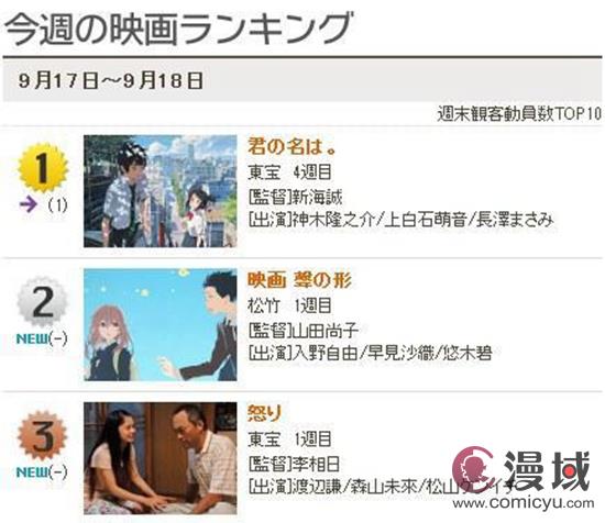 另外,周末电影票房排行中,票房冠军是新海诚的动画电影《你的名字。》,由绫野刚和妻夫木聪出演的描写大胆同性恋行为的悬疑真人电影《怒》排在榜单第三位,该电影同样是在9月17日上映,值得一提的是,周末榜的二三名都被新上映电影包揽。