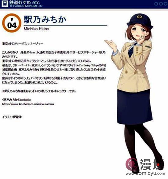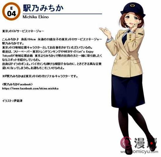 駅乃みちか是东京地铁(东京メトロ)的铁道娘,也可以说是东京地铁的标志物。她常常帮助东京地铁公司宣传交通安全规则、报告误点情况、宣传季节活动等等。原本是Q版大头形象最近突然就改变了画风。曾经长相可爱亲切的铁道娘,一反常态变成了穿着黑丝短裙的美女。