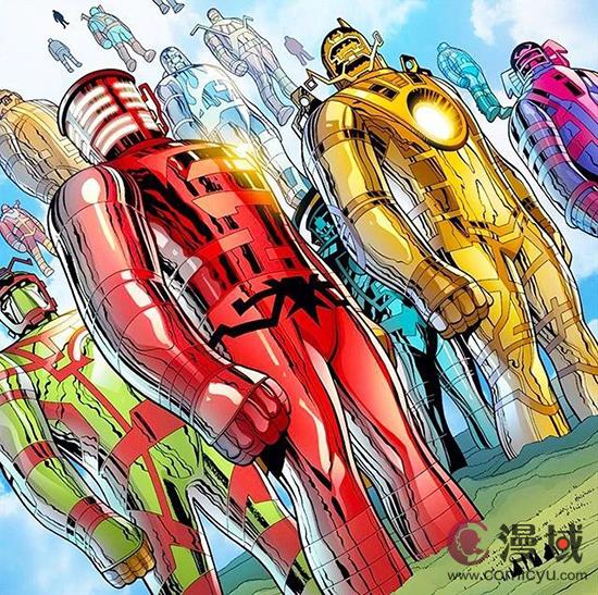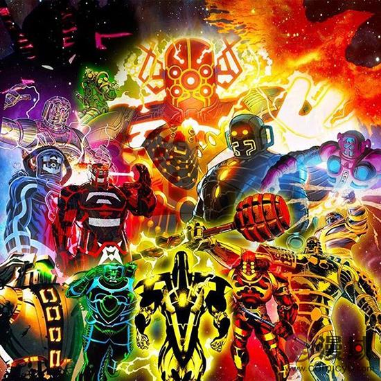 艾尔·尤因的《终极战队》系列展示了柯比最疯狂、最宇宙的想法。他展示了一个贫瘠、没有生命、空虚而孤独的世界,被称为“第一苍穹”。这个“第一苍穹”创造了一个名为“野心家”(Aspirants)的种族,作为它的崇拜者,他们将生活在宇宙中。但是,当一些野心家希望他们的造物能够改变和进化时,他们分裂了,这些分裂的反叛者被称为天神组。天神组和野心家之间爆发了一场战争。最后,天神组展示了他们的终极武器——摧毁了整个宇宙,将它粉碎成充满无限可能性的多元宇宙。因此,从某种意义上来说,天神组是整个多元宇宙的创造者;他们穿越星际,在生物世界中播下进化和变异的潜力,然后判断他们的创造物是否有生存价值。