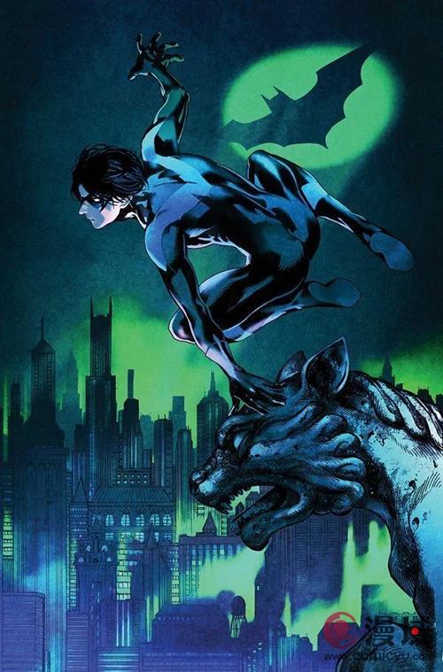 卡门·希拉哈马的绘画风格非常适合这个角色,因为迪克的快速运动能力表现得非常出色,这也是他的一种风格。与今年画迪克的其他艺术家不同,近来有很多相当笨重和肌肉发达的夜翼艺术,但是希拉哈玛用的是更适合迪克不断翻转、灵活轻快的身体来呈现。这里的颜色搭配也很棒。绿色和深蓝色的混合与夜晚交相辉映,同时避免了看起来沉闷的场景。这里给人一种异想天开的感觉,非常适合迪克。