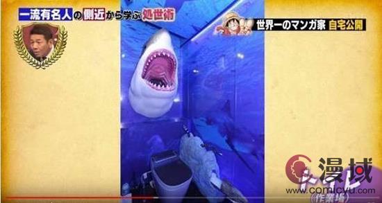 接下来就是厕所,整个厕所看起来就像是海底世界,马桶上面还有一头大白鲨,不愧是《海贼王》的作者,不知道尾田的马桶是不是直接连着鱼人岛呢?