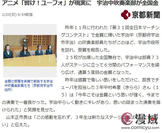 《吹响吧!上低音号》是一部以日本京都府宇治市为舞台,北宇治高中吹奏部为主要角色的动画作品,故事中北宇治高中吹奏部与金奖失之交臂,只拿到了银奖让角色们十分不甘。在三年级毕业之后,大家再次向着金奖努力。1月20日据日本京都新闻报道,现实中的宇治中吹奏部获得了全日本的金奖,像是把动画的剧情还原了一样。