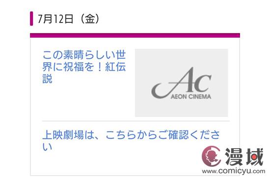 不少影视情报在官方正式宣布前都可能从各个渠道流出。今天(1月21日),日本连锁电影院AEON CINEMA发表了排片名单,其中剧场版动画《为美好的世界献上祝福!红传说》也位列其中。本作将与7月12日在日本上映。