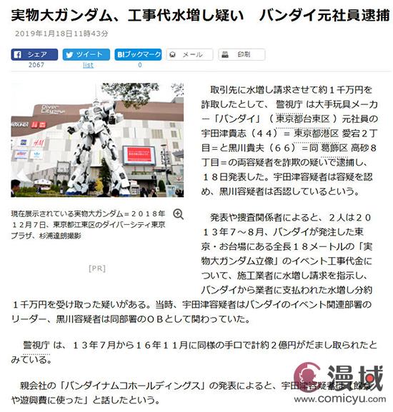据朝日新闻报道,两名万代前员工被指控在2013年7月至8月万代订做东京台场全高18米的等身大高达的时候向万代虚报了约1000万日元(约合62.2万元人民币)的工程款。其中一人是万代分管活动相关部署的领导,另一位嫌疑人是同部门的原职工。除此之外,这两人从2013年6月至2016年11月使用同样的手段贪污了约2亿日元(约合1243.5万元人民币)的公款。据万代南梦宫透露,宇田津嫌疑人称“钱拿去吃喝玩乐了”,这么回答也算是条汉子。