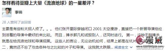 在回答问题“怎样看待豆瓣上大量《流浪地球》的一星差评?”时,李楠则表示,主要是因为电影的粉丝太烦了,捧杀郭凡(导演)和诋毁别人同时进行,贬低别人抬高自己的幼儿园逻辑实属招黑。