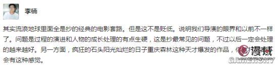 李楠表示,《流浪地球》中全是抄的经典的电影套路:“其实流浪地球里面全是抄的经典的电影套路。但是这不是贬低。说明我们导演的眼界和以前不一样了。问题是过程的演进和人物的成长处理的有点生硬,这是抄最常见的问题,不过以后一定会处理的越来越好。另一方面,疯狂的石头阳光灿烂的日子重庆森林这种天才爆发的作品,你就打死都不会有这种感觉。