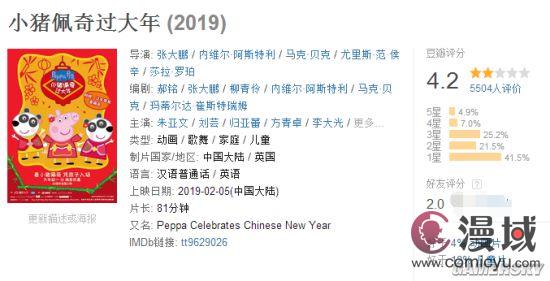 《小猪佩奇过大年》豆瓣评分4.2,春节档垫底,猫眼上也只有5.4分,比起同为合家欢电影的《熊出没》要低了不少,后者的豆瓣分数有6.5,猫眼上更是高达9.2分。