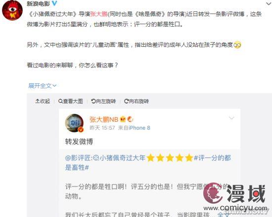 而据新浪电影报道,《小猪佩奇过大年》导演张大鹏(同时也是《啥是佩奇》的导演))近日转发了一条给该片打出了五星的影评微博,该条微博带了“评一分的都是畜牲”的tag,博文中第一句便是“评一分的都是牲口啊”,这一举动引发了网友热议,目前该转发已经被删除。