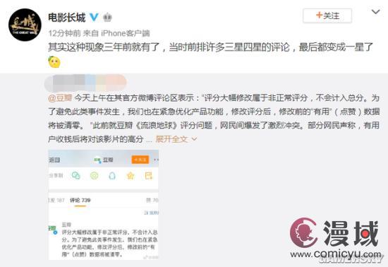 而12日,电影《长城》转发了一条豆瓣改分的微博,称:“其实这种现象三年前就有了,当时前排许多三星四星的评论,最后都变成一星了。”并附上柠檬表情,似乎意有所指。