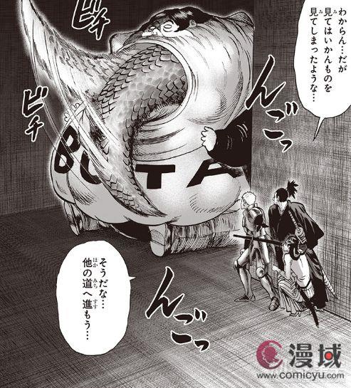 之后弩S就是一招被秒,开始看她气势满满还以为能多撑几回合,这样直接败下阵来还真是有点没想到。不过甜心假面也真是够狠辣,果然是一个都不留。先行离开的几位英雄在一个拐角处碰到了豚神,他刚刚吃下一个个头很大的怪人。