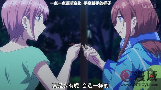 按道理,这一花主场,攻势又如此猛烈,还是香菜配音,再怎么样粉丝也得按倍数往上加。然而一花的结局早已注定,甚至制作组都光明正大的明示了。粉丝表示不忍直视,心疼一花,三玖天下第一。没错,就是一花最后那个让烟花的行为。其他三姐妹都各自选好了烟花,只有一花和三玖两人拿到共同的烟花。也可以说那个烟花就是男主,毕竟现在被攻略的确实是一花和三玖。