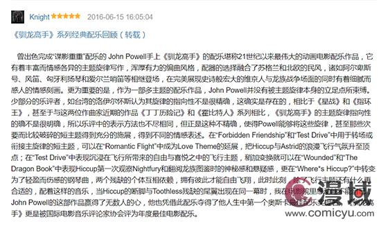 曾出色完成“谍影重重”配乐的 John Powell手上《驯龙高手》的配乐堪称21世纪以来最伟大的动画电影配乐作品,它有着丰富而情感各异的主题旋律写作,浑厚有力的编曲风格,配器的选择融合了苏格兰和北欧的民风,诸如阿尔卑斯号、风笛、匈牙利扬琴和爱尔兰哨笛等相继登场,在完美展现史诗般宏大的维京人与龙族战争场面的同时有着细腻而感人的情感刻画。更为重要的是,作为一部多主题的配乐作品,John Powell并没有被主题旋律本身的立足点所束缚。少部分的乐评者,如台湾的洛伊尔怀斯认为其旋律的指向性不是很精确,这确实是存在的,相比于《星战》和《指环王》,甚至于与这两位作曲家近期的作品《丁丁历险记》和《霍比特人》系列相比,《驯龙高手》的主题旋律指向性的确不是很明确,所以乐评中的表示方法也不尽相同,但正是这种不精确,使得Powell能够将这些旋律,甚至那些次要而比较破碎的短主题得到充分的施展,得到不同的情感表述。在“Forbidden Friendship”和“Test Drive”中用于转场或衔接主旋律的短主题,可以在“Romantic Flight”中成为Love Theme的延展,把Hiccup与Astrid的浪漫飞行气氛升至顶点;在“Test Drive”中表现沉浸在飞行所带来的自由与喜悦之中的飞行主题,稍加变换就可以在“Wounded”和“The Dragon Book”中表现Hiccup第一次观察Nightfury和翻阅龙族图鉴时的神秘感和悬疑感,更在“Where*s Hiccup?”中转变为了轻盈而伤感的钢琴曲,两个残缺的个体互相依赖,拥有彼此才能自由飞翔,此时此刻,除了飞行主题还有什么更合适的,配着这样的音乐,当Hiccup的断脚与Toothless残缺的尾翼出现在同一幕时,我在电影院里感动地不能自已,John Powell的这部作品赢得了无数人的心,他也凭借此配乐夺得了他人生中第一个奥斯卡最佳配乐奖提名,《驯龙高手》更是被国际电影音乐评论家协会评为年度最佳电影配乐。