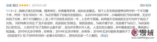 1>3>2,隐秘之境五彩斑斓、精美绝伦,仿佛置身梦境,宛如走进童话。 每个人生来就是被劈成两半的一个不完整个体,终其一生在寻找另一半,Ta正好填补了你缺失的那部分。 从2010年到2019年,小嗝嗝找到了阿丝翠德,无牙仔找到了光煞,两个不完整的人(龙)终于找到生命的另一半,人生终于圆满。前两部不会画画的无牙仔也终于画出了光煞。 同时电影又传达了“龙不是宠物,而是朋友”的理念。 既然是朋友,Ta就不属于你,而是属于Ta自己,Ta应该有自己的生活。 人类并非“没了龙就什么都不是”,龙也并非离不开人类。 人龙告别太催泪,多年重逢很治愈,兼具虐心和温暖。 2010年无牙仔单身,你单身; 2014年无牙仔单身,你单身; 2019年无牙仔都有老婆孩子了,你仍然单身。 《驯龙高手》给了你9年时间找一起看大结局的人,然而你还是一个人看的。