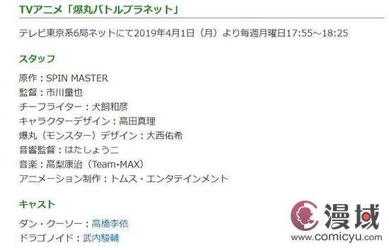 动画中,曾饰演《为这美好的世界献上祝福》惠惠、《Re:从零开始的异世界生活 》爱蜜莉雅的人气声优高桥李依将为主人公ダン?クーソー配音,曾饰演《偶像大师:灰姑娘女孩》制作人、《火之丸相扑》久世草介的武内骏辅将巍∩ラゴノイド配音。SPIN MASTER负责原作,市川量也担任监督一职,犬饲和彦负责主要脚本,高田真理担任角色设计,大西佑希担任爆丸的角色设计,はたしょう二担任音响监督,高梨康治(Team-MAX)负责音乐,TMS Entertainment负责动画制作。