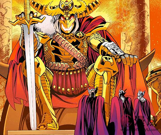 全父奥丁你可能听说过,也就是雷神的父亲,阿斯加德的统治者。但后来奥创直接攻占了阿斯加德并取代了奥丁的位置,成为了全父奥创,他是漫威创作过的最强大的奥创版本。他有一把巨大的剑,一身黄金盔甲和一个与之相配的宝座。在摧毁了复仇者和所有抵抗力量之后,他奴役剩下的人类,开始建造一支机器人军队。他甚至还创造了一个AI版的复仇者。虽然他看上去很牛,但也逃不过编剧大大的随手一笔,结果被双持雷神锤的女雷神一击秒杀!