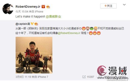 而他的这一愿望看来真要实现了,今天小罗伯特·唐尼在微博上转发了马龙的这条微博,并表示:“Let’s make it happen!(就让这事成真吧!)”,同时还@了漫威影业官微,看来他想让官方来给他们安排一下。