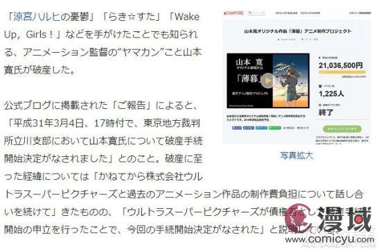 日本知名动画导演山本宽在11日发布博客称自己已经破产,法院开始执行破产程序。不过山本宽表示这是他自己的个人问题,不会对正在准备中的剧场版动画《薄暮》产生影响。