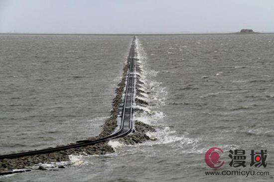 事实上关于“海原电铁”的原型,大概就是1959年日本爱知县遭台风后发了大水,导致铁轨被水淹没的景象。当时导致了很多人被波及到,还有多条主干道交通瘫痪。虽然很美,可并不是什么好事。而世界上确实有特意弄在海上的铁轨,比如德国法国,还有我国西北地区的盐湖也是一大美景。
