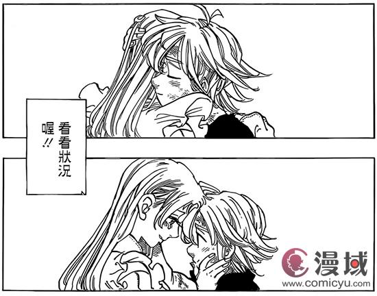 团长在上一话中了魔神王的阴谋而失去战意,反过来被魔神王各种攻击,结果老婆伊丽莎白和七大罪众人一起来到团长的面前。见到众人尤其是伊丽莎白的团长立马就振作了起来,还与伊丽莎白非常亲密的抱在一起一解相思之苦。魔神王的阴谋落空了,原本还想借伊丽莎白来打击团长,现在反而是伊丽莎白让团长重新振作,局面一下子就反转了。