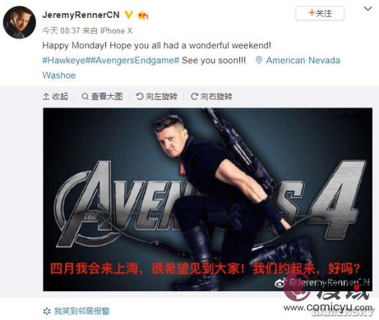 《复仇者联盟4:终局之战》虽然内地尚未定档,但我们都知道距离官宣的日子已经越来越近了。今天“鹰眼”杰瑞米·雷纳在微博宣布,自己将于4月份来中国上海宣传《复联4》,请粉丝们和自己约起来。
